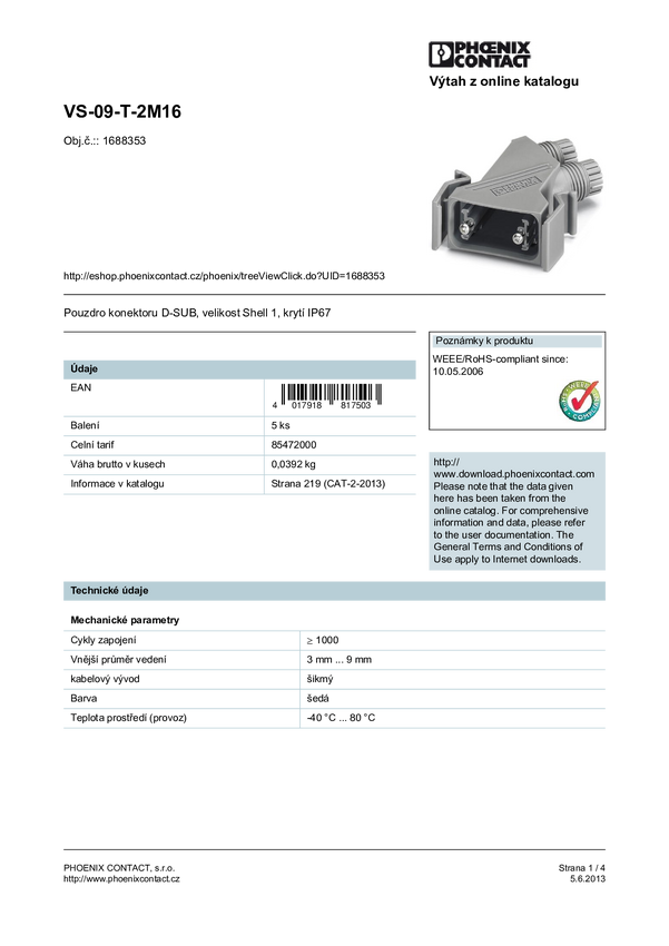 Phoenix Contact VS-09-T-2M16 1688353 tworzywo sztuczne, metalizowane 180 ° srebrny 5 szt.
