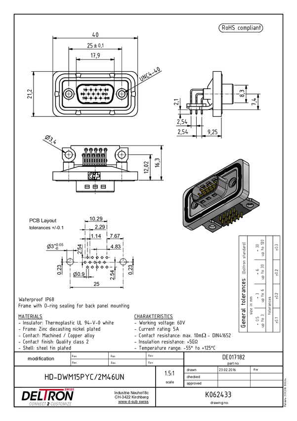 Deltron Connectors HD-DWM15PYC/2M46UN Złącze męskie D-Sub, rzędy: 3, styki: 15, 90 °, 1 szt.