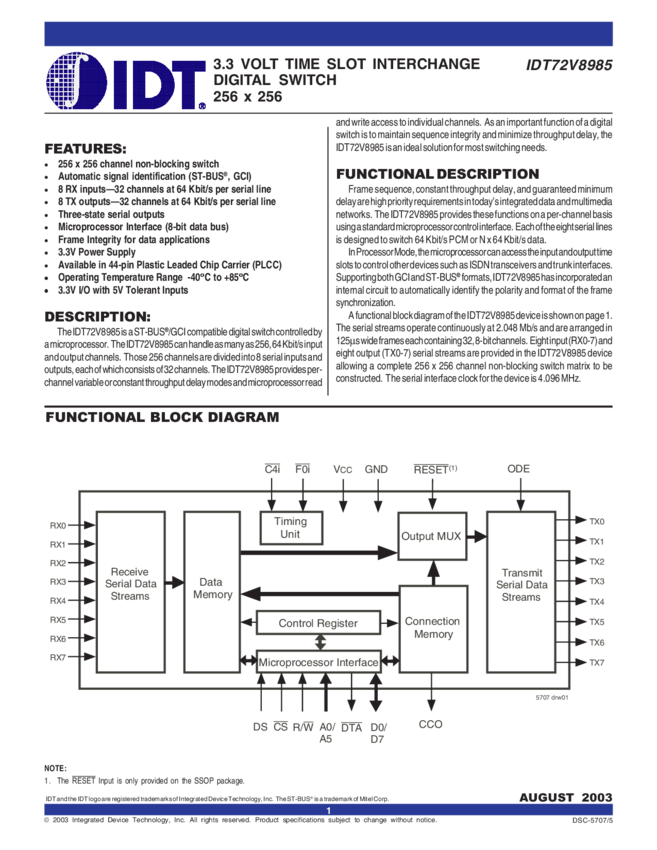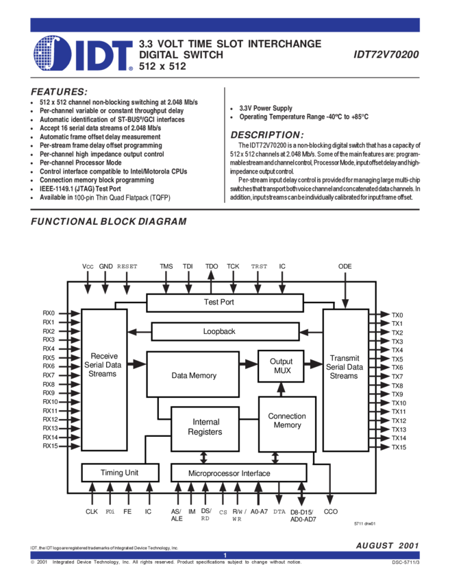256 x 256 TSI, 8 I/O at 2Mbps, Variable/Constant Delay, 3.3V
