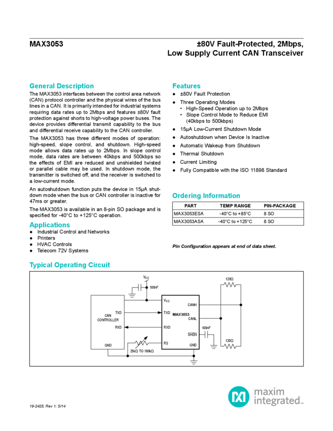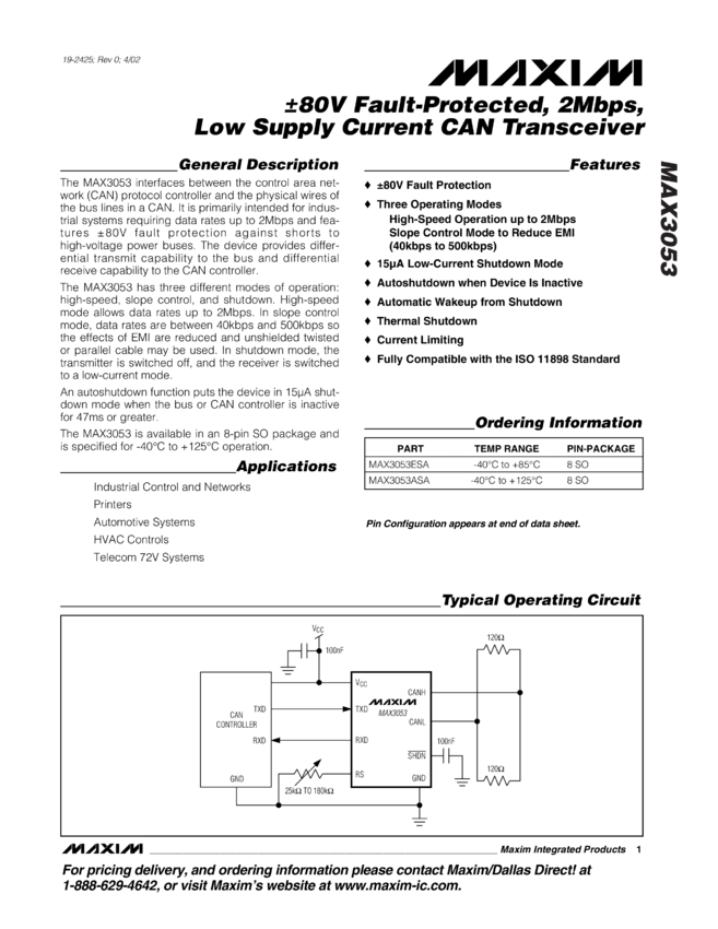 MAX3053 &#17780V Fault-Protected, 2Mbps, Low Supply Current CAN Transceiver
