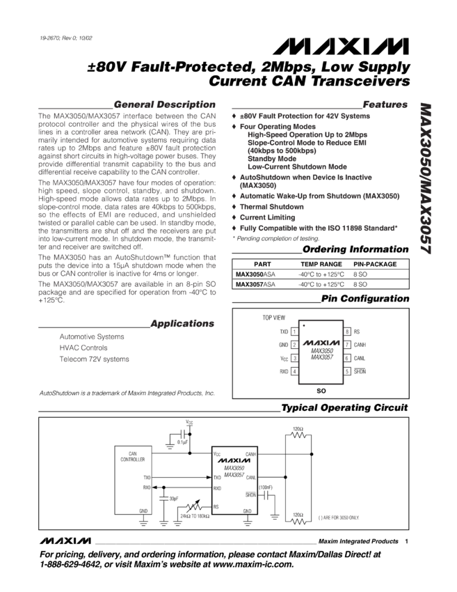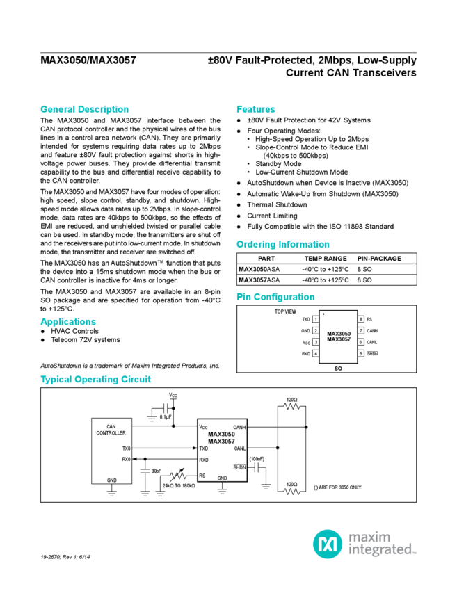 MAX3050, MAX3057 ±80V Fault-Protected, 2Mbps, Low Supply Current CAN Transceivers