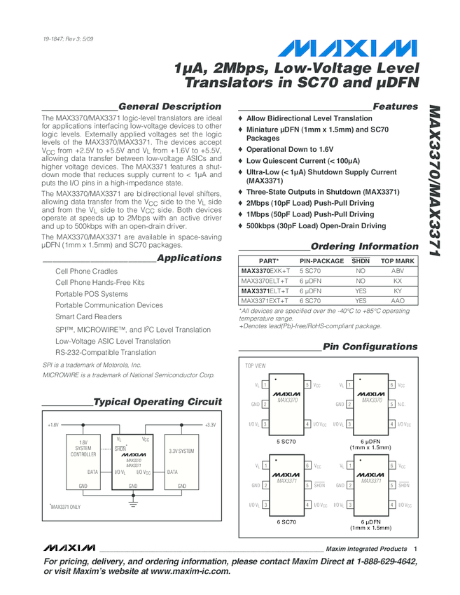 MAX3371 1&#181A, 2Mbps Bidirectional Level Translator