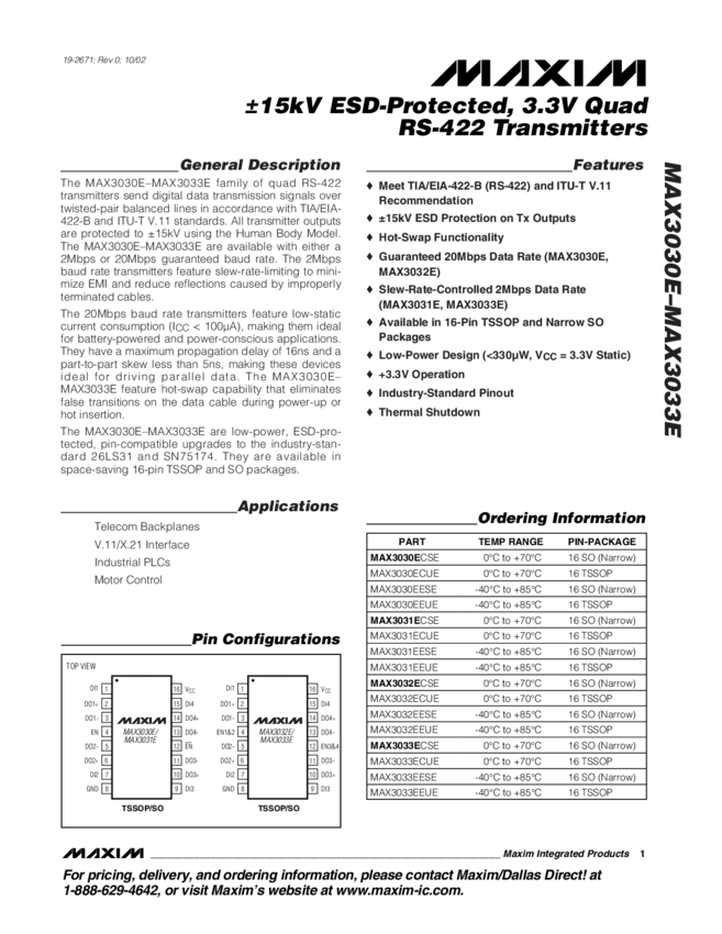 MAX3033E &#17715kV ESD-Protected, 3.3V , 2Mbps Quad RS-422 Transmitters