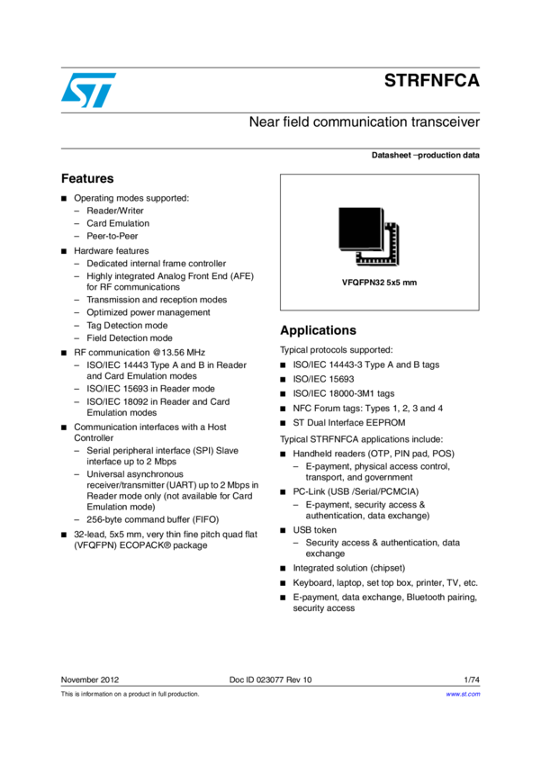 NFC Transceiver 2TX 2RX 2Mbps 32-Pin VFQFPN