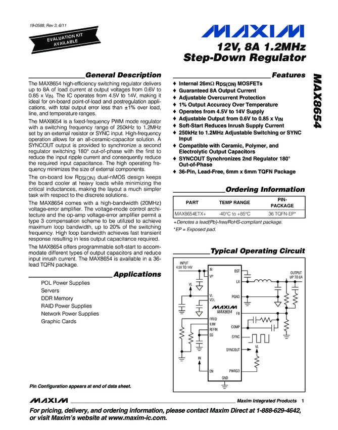 MAX8654 12V, 8A, 1.2MHz, Step-Down Regulator