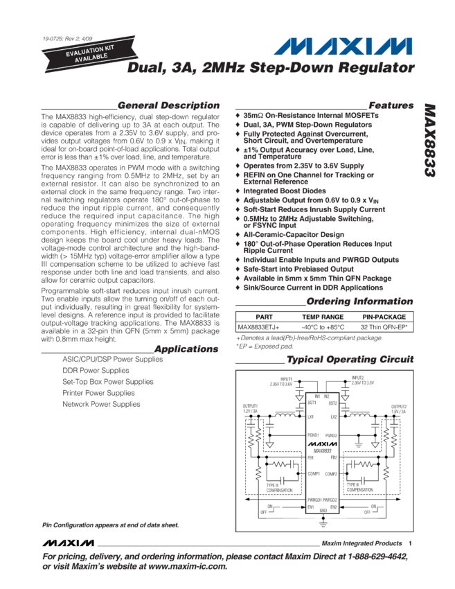 MAX8833 Dual, 3A, 2MHz Step-Down Regulator
