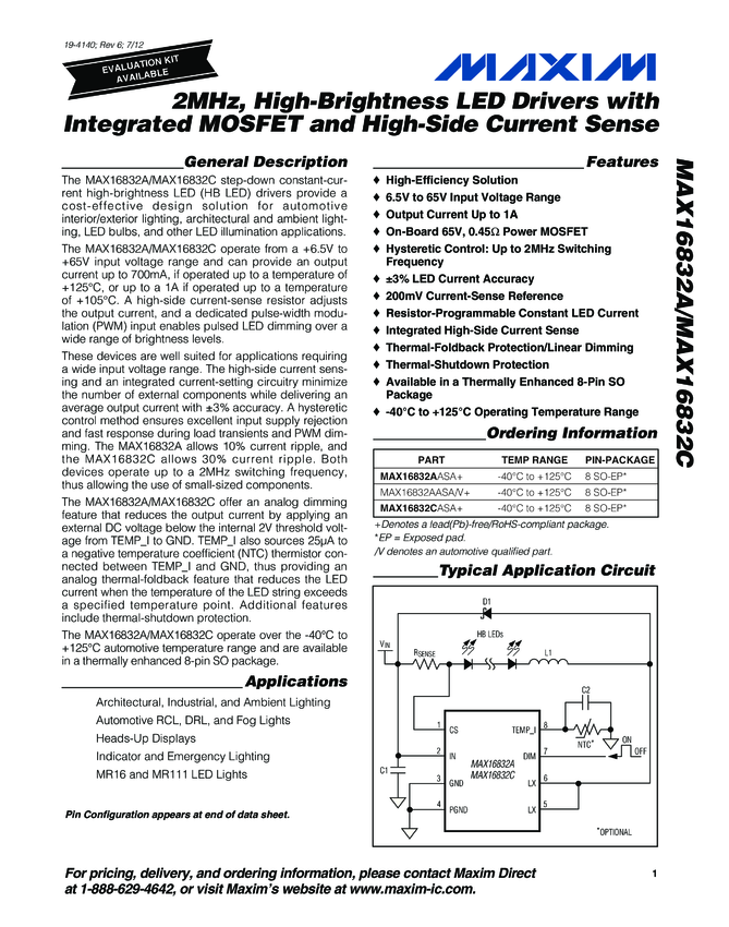 MAX16832A, MAX16832C 2MHz, High-Brightness LED Drivers with Integrated MOSFET and High-Side Current Sense