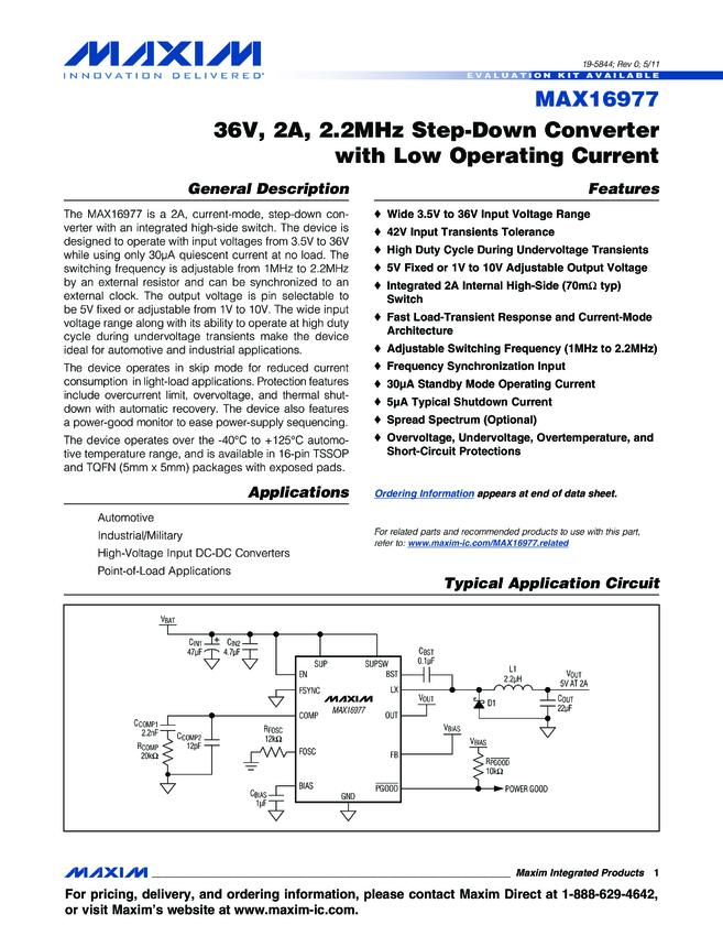 MAX16977 36V, 2A, 2.2MHz Step-Down Converter with Low Operating Current