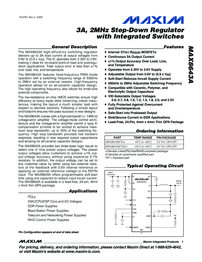 MAX8643A 3A, 2MHz Step-Down Regulator with Integrated Switches