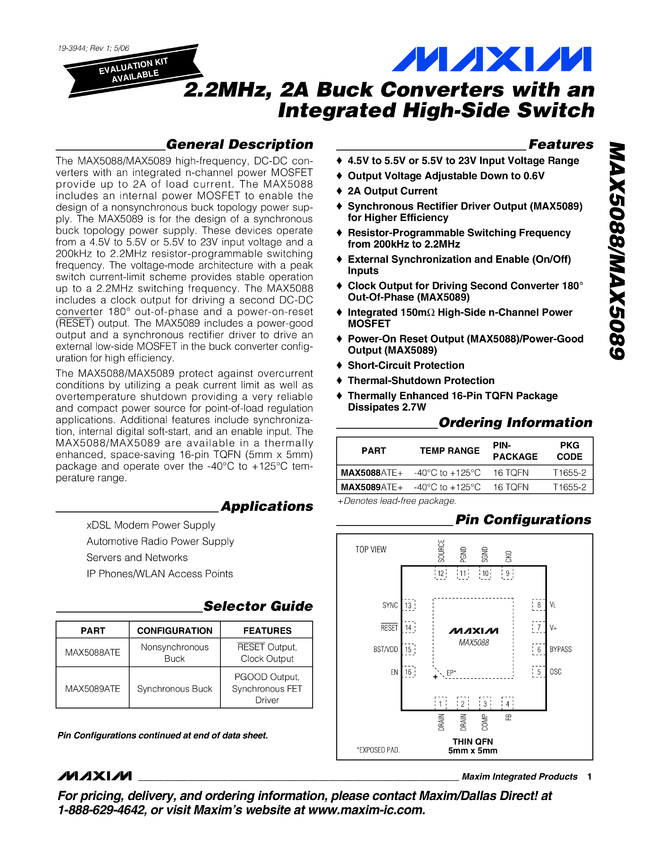 MAX5088, MAX5089 2.2MHz, 2A Buck Converters with an Integrated High-Side Switch