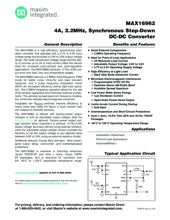 MAX16962 4A, 2.2MHz, Synchronous Step-Down DC-DC Converter