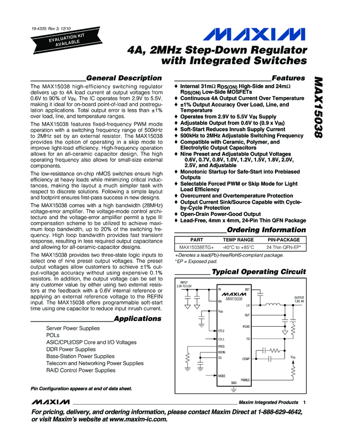 MAX15038 4A, 2MHz Step-Down Regulator with Integrated Switches