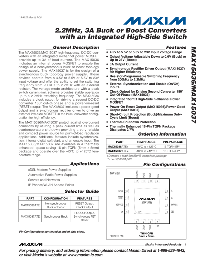 MAX15036, MAX15037 2.2MHz, 3A Buck or Boost Converters with an Integrated High-Side Switch