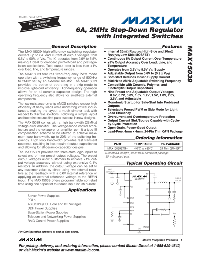 MAX15039 6A, 2MHz Step-Down Regulator with Integrated Switches