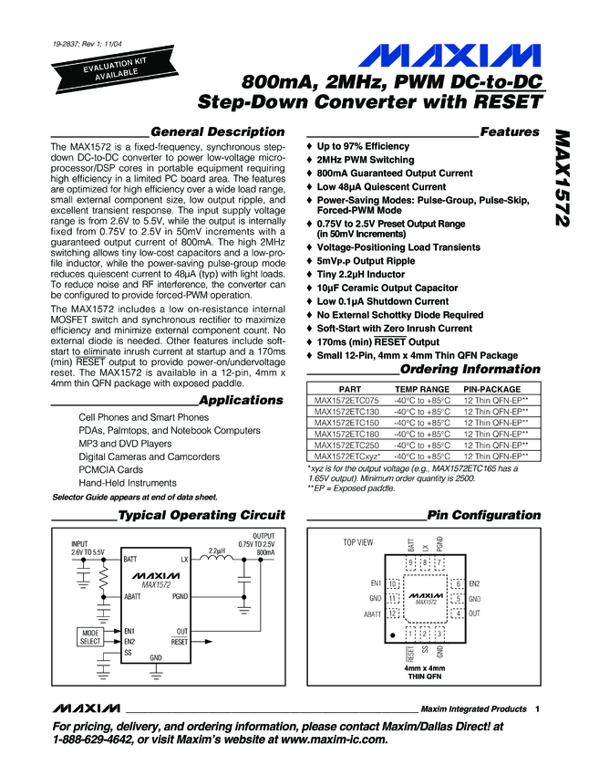 MAX1572 800mA, 2MHz, PWM DC-to-DC Step-Down Converter with Reset
