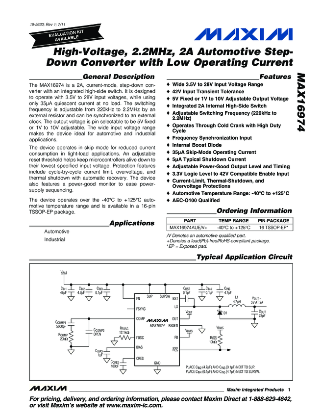 MAX16974 High-Voltage, 2.2MHz, 2A Automotive Step-Down Converter with Low Operating Current