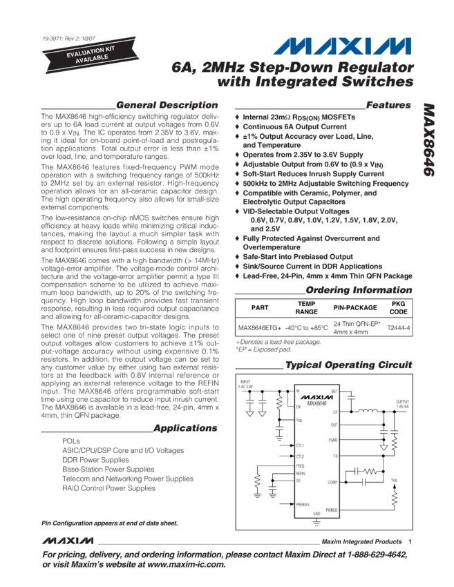 MAX8646 6A, 2MHz Step-Down Regulator with Integrated Switches
