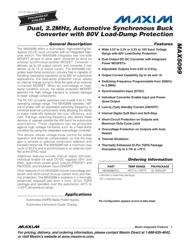 MAX5099 Dual, 2.2MHz, Automotive Synchronous Buck Converter with 80V Load-Dump Protection