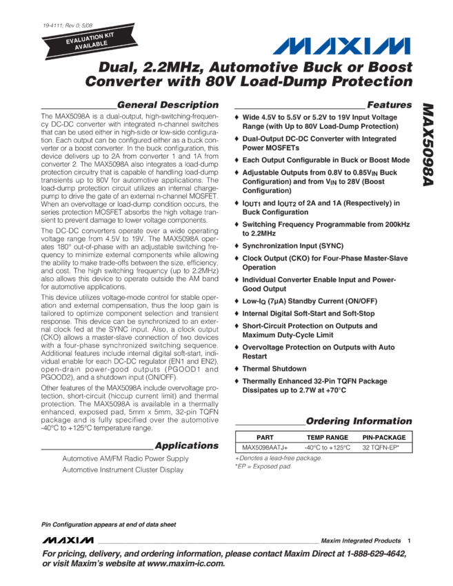 MAX5098A Dual, 2.2MHz, Automotive Buck or Boost Converter with 80V Load-Dump Protection