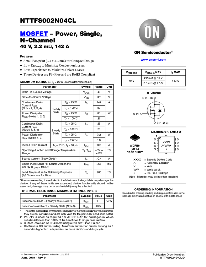 Power MOSFET, 40V, 2.2mOhm, 142A, Single N-Channel