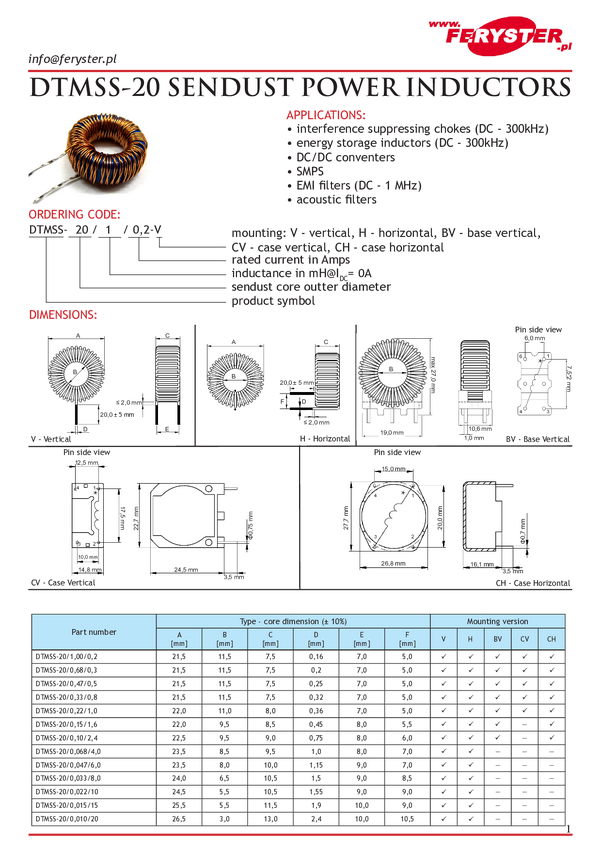 Dławik; DTMSS-20/0.010/20-V; drutowy; 10uH; 20A; 4,2mOhm; fi 26,5x13mm; THT; RoHS