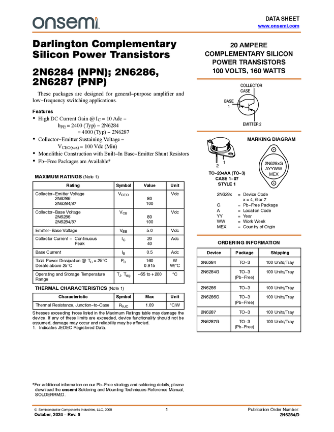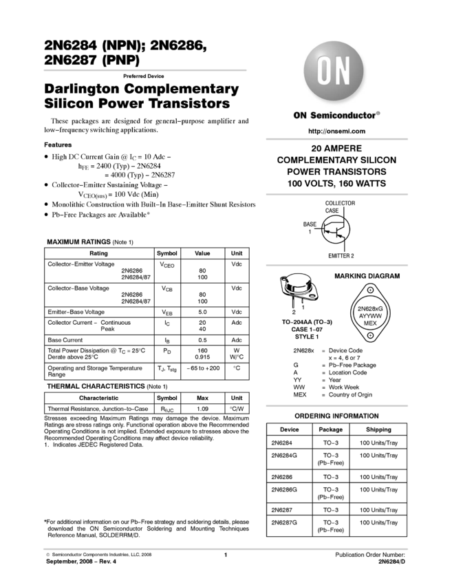 20 A, 100 V NPN Darlington Bipolar Power Transistor