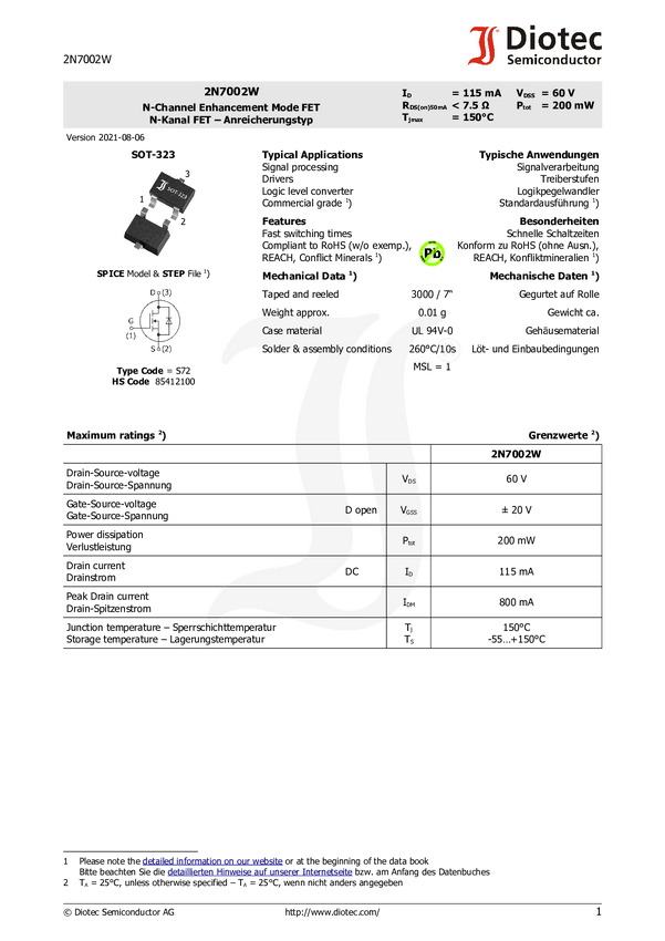 MOSFET Diotec 2N7002W N/A N/A 2N7002W