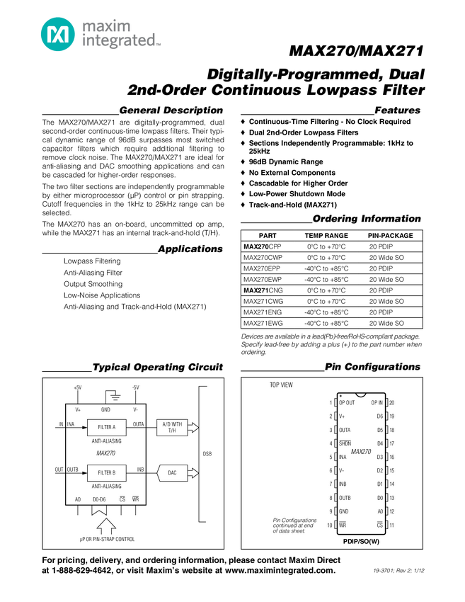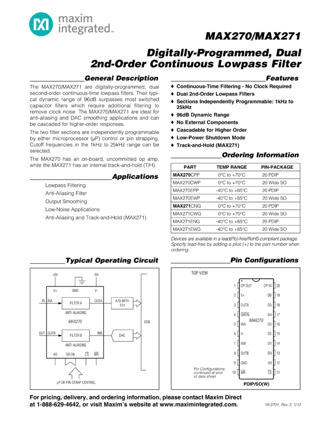 MAX270, MAX271 Digitally-Programmed, Dual 2nd-Order Continuous Lowpass Filter