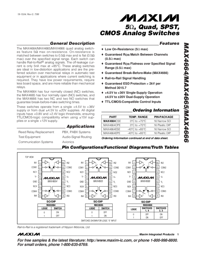 MAX4666 5 Ohm, Quad SPST, CMOS Analog Switch (2NO, 2 NC)