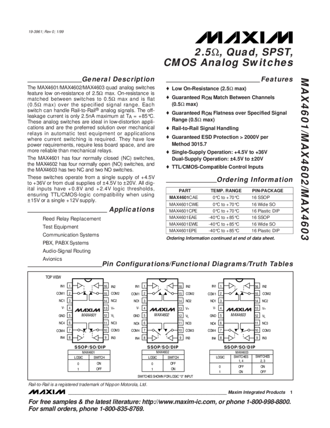 MAX4603 2.5 Ohm, Quad, SPST, CMOS Analog Switches (2NO, 2 NC)