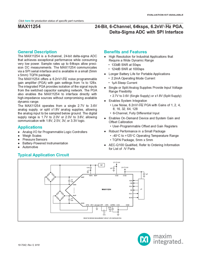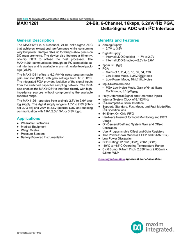 MAX11259 24-Bit, 6-Channel, 16ksps, 6.2nV/&#129&#227Hz PGA, Delta-Sigma ADC with I2C Interface