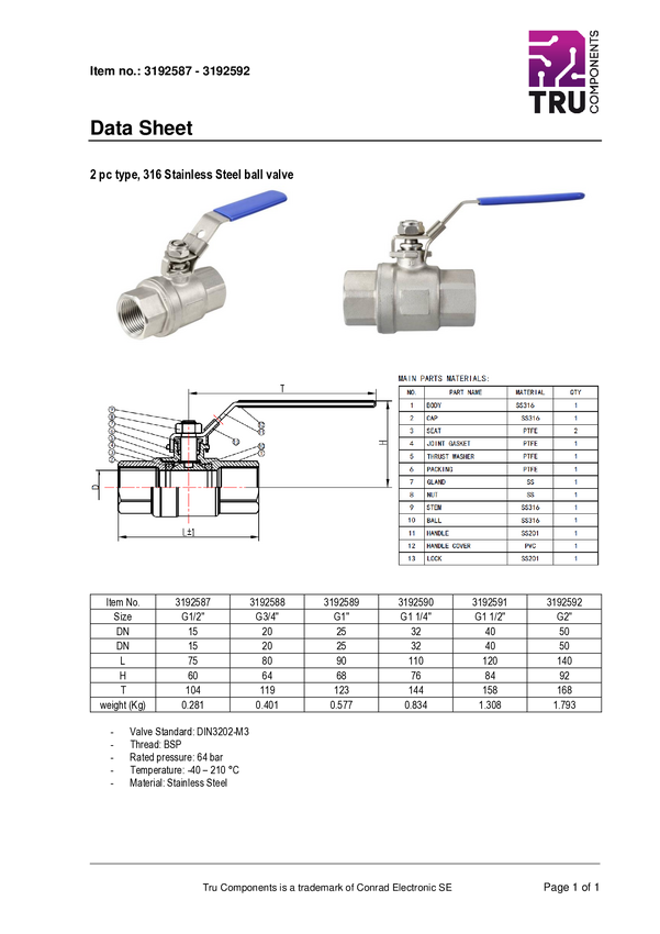 Zawór kulkowy, standardowy TRU COMPONENTS TC-2PC-DN20-316 TC-12770352