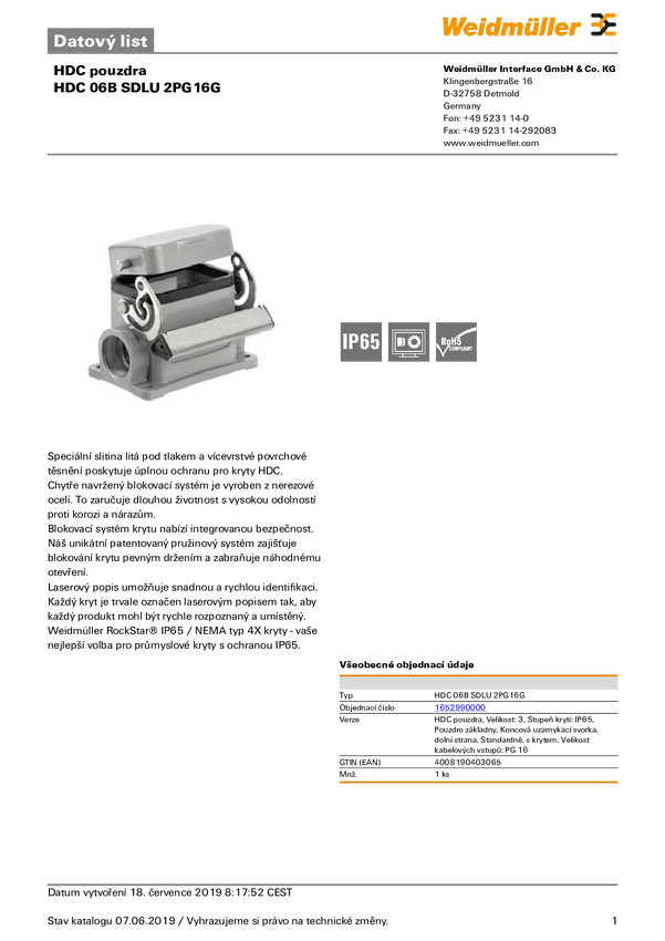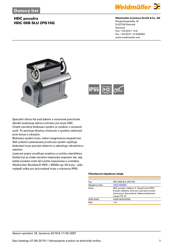 Weidmüller HDC 06B SDLU 2PG16G 1652990000 Obudowa podstawowa 1 szt.
