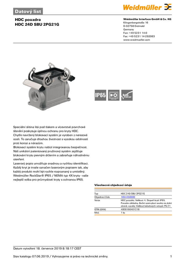 Weidmüller HDC 24D SBU 2PG21G 1654450000 Obudowa podstawowa 1 szt.
