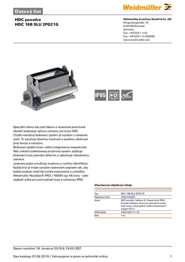 Weidmüller HDC 16B SLU 2PG21G 1658120000 Obudowa podstawowa 1 szt.