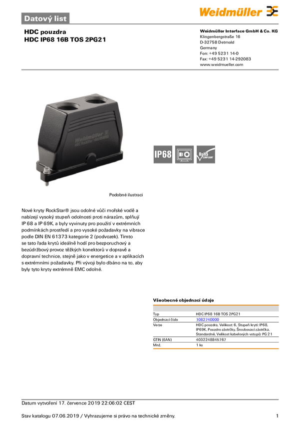 Weidmüller HDC IP68 16B TOS 2PG21 1082740000 Obudowa złącza męskiego 1 szt.