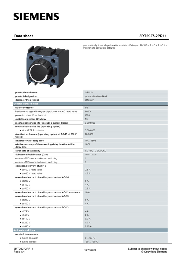Blok przekaźnika czasowego Siemens 3RT2927-2PR01 3RT29272PR01, 1 szt.