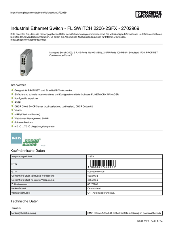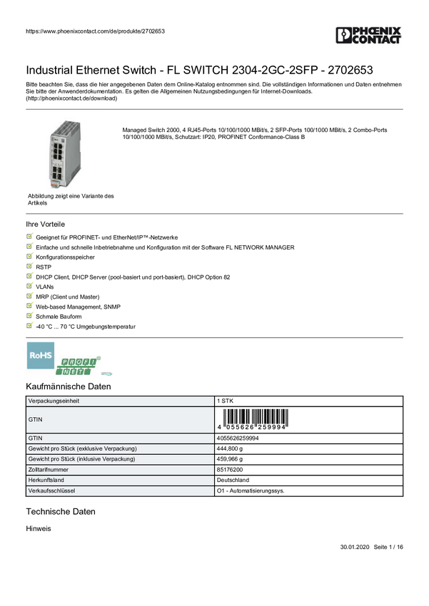 Phoenix Contact FL SWITCH 2304-2GC-2SFP Switch sieciowy zarządzalny 4 porty 10 / 100 / 1000 MBit/s