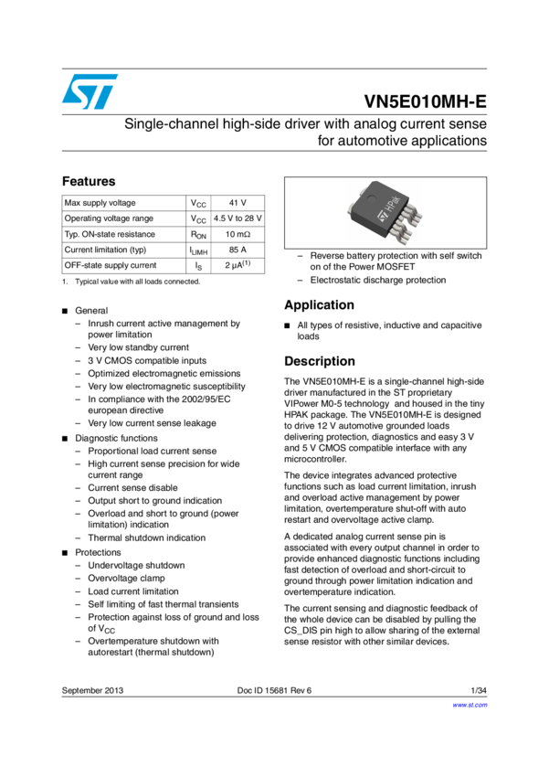 Current Limit SW 1-IN 1-OUT -0.3V to 7.3V 12-Pin(10+2Tab) PowerSO T/R