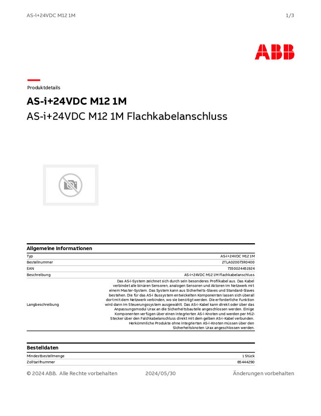 ABB 2TLA020073R0400 Płaskie połączenie kablowe AS-I 24DC M12 1M 1 szt.