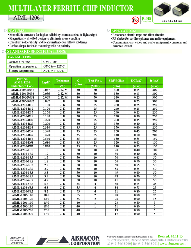Ind RF Chip Shielded Multi-Layer 1.2uH 10% 10MHz 50Q-Factor Ferrite 100mA 1206 T/R