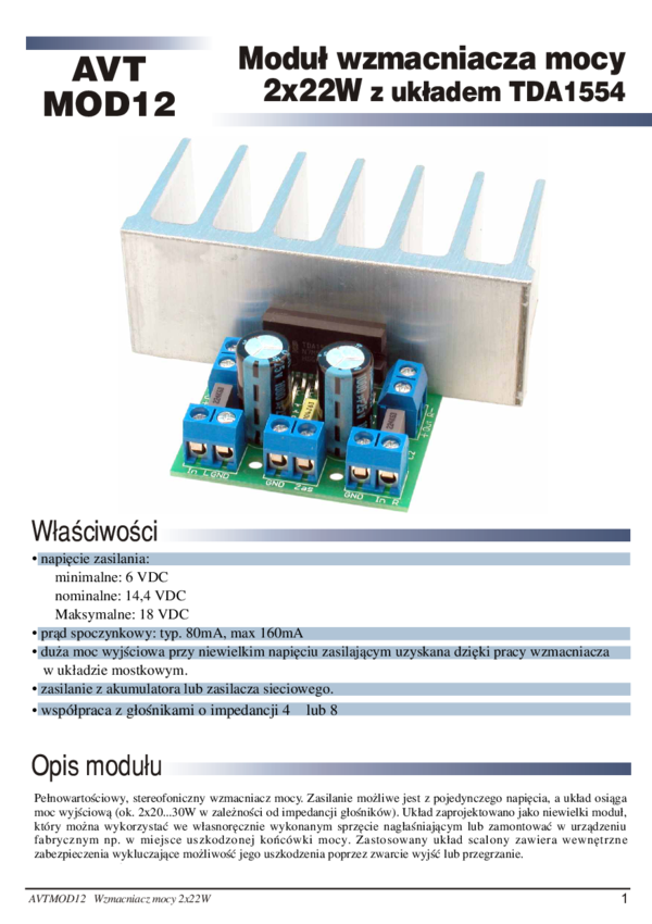 AVTMOD12 Moduł wzmacniacza mocy 2x22W z układem TDA1554
