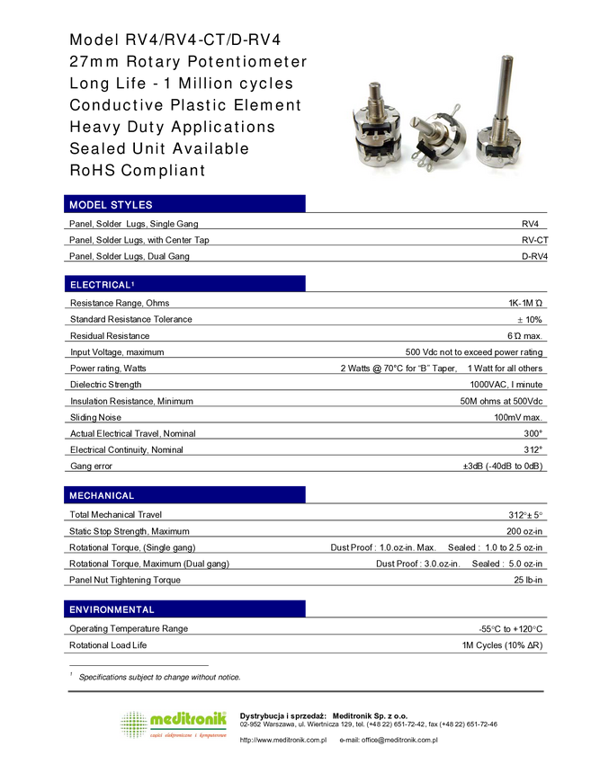 Potencjometr węglowy (hot molded) podwójny Bushing 3/8-32UNE F; RV4; śr.28,5mm gł. 28.8mm; ośka 6,35mm; dł. 22mm, 2x2W; kąt.el.314 st. ze stopami; trwałość 25.000 cykli Charakterysyka logarytmiczna A (B); Rezystancja 2 x 1 kohm
