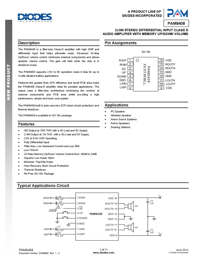 2x3W STEREO DIFFERENTIAL INPUT CLASS D AUDIO AMPLIFIER WITH UP/DOWN CONTROLLER