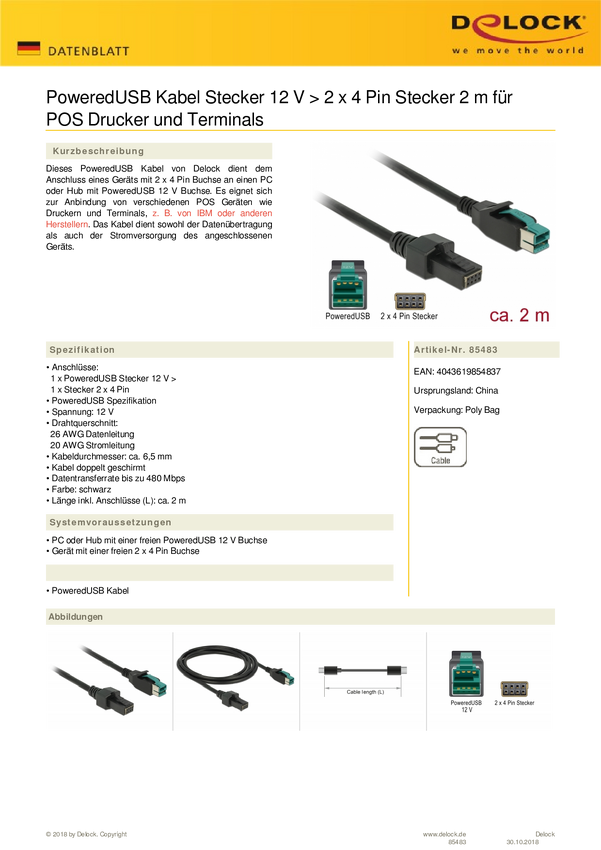 Delock Kabel USB USB 2.0 Wtyczka zasilania USB 12V, Wtyczka zasilania USB 12V 2x4pol 2.00 m czarny 85483