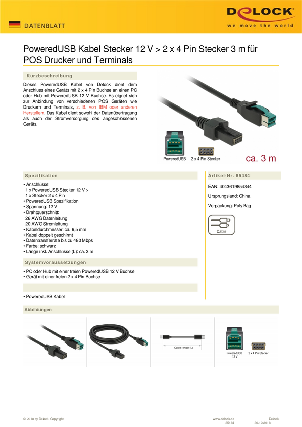 Delock Kabel USB USB 2.0 Wtyczka zasilania USB 12V, Wtyczka zasilania USB 12V 2x4pol 3.00 m czarny 85484