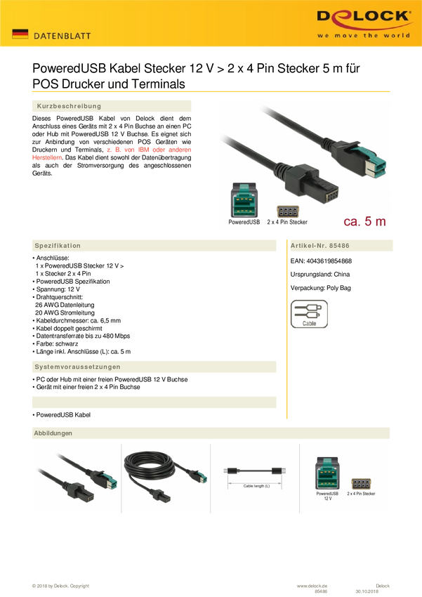Delock Kabel USB USB 2.0 Wtyczka zasilania USB 12V, Wtyczka zasilania USB 12V 2x4pol 5.00 m czarny 85486