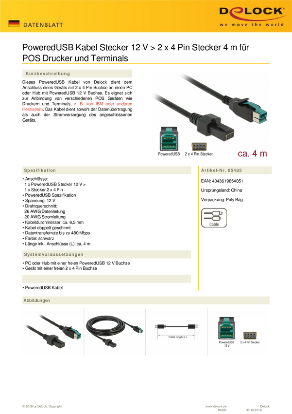Delock Kabel USB USB 2.0 Wtyczka zasilania USB 12V, Wtyczka zasilania USB 12V 2x4pol 4.00 m czarny 85485