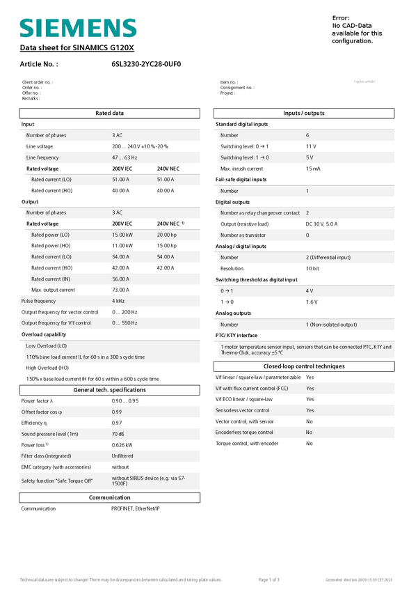 Przemiennik częstotliwości Siemens 6SL3230-2YC30-0UP0