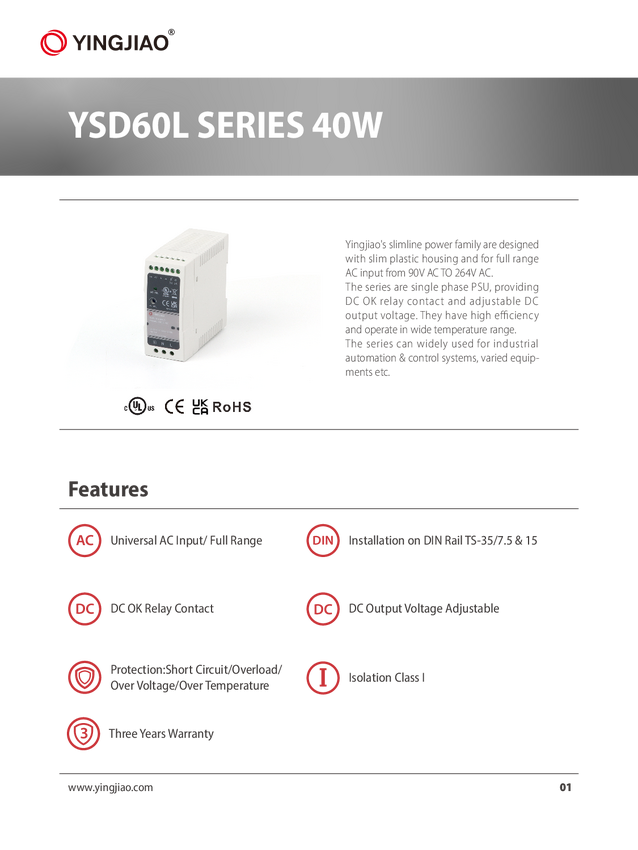 Zasilacz na szynę DIN 12V 3,33A 40W YINGJIAO | YSD60L-1203330
